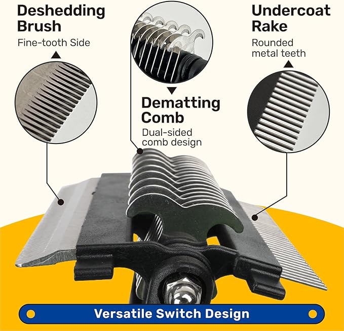 - 【Versatile Switch Design】 The innovative design allows easy switching between the dematting rake and smoothing comb, adapting to various grooming needs. The dual-sided comb features wide teeth for loosening tough knots and fine teeth for detailed grooming, effectively removing loose hair and tangles.
