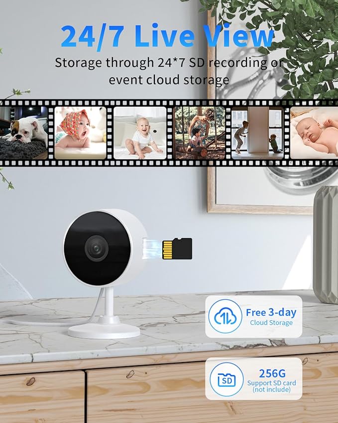 - 【7*24h SD recording/Cloud Storage】Home security camera supports 7*24h SD card recording(up to 256GB) and cloud storage. It offers 3-Day Free Trial cloud storage. Cloud storage premium features, including artificial intelligence recognition, upgraded cloud storage, customized alert zones, and more, at $3.99 per month.