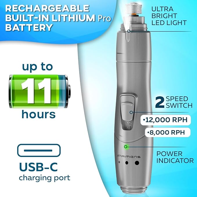 - Forget about low battery after the first use or even worse - during the nail trimming process. Our rechargeable dog nail grinder works up to 11 hours on a single charge. Because it’s cordless, you can use this electric dog nail grinder from anywhere. Find the place where your pet feels safe and comfy, and finally do that trimming thing without stress.