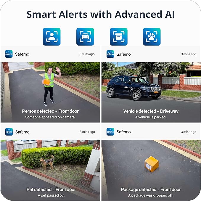 - AI Smart Detection & Instant Alerts:Tired of meaningless alerts? Our smart security cameras reduce false alerts with AI-powered motion detection that accurately recognizes people, pets, vehicles, and packages. With a 30ft detection range, custom monitoring zones, and real-time notifications via the Safemo App, you’ll always be alerted to what matters most. No more unnecessary alerts—only real threats