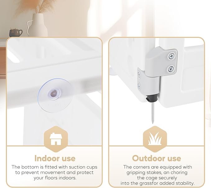 - Easy Installation: Our dog pen has 3 non-door panels and 1 with door panels, each with rubber feet to protect the floor. By snapping the panels into place, the pet pen can be easily assembled together