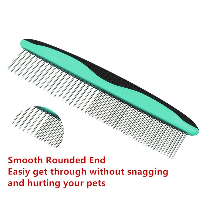 - STAINLESS STEEL PINS: with sharp teeth, this dog grooming comb features round teeth that break up tangles +effectively remove loose hair, dander & dirt trapped beneath fur.