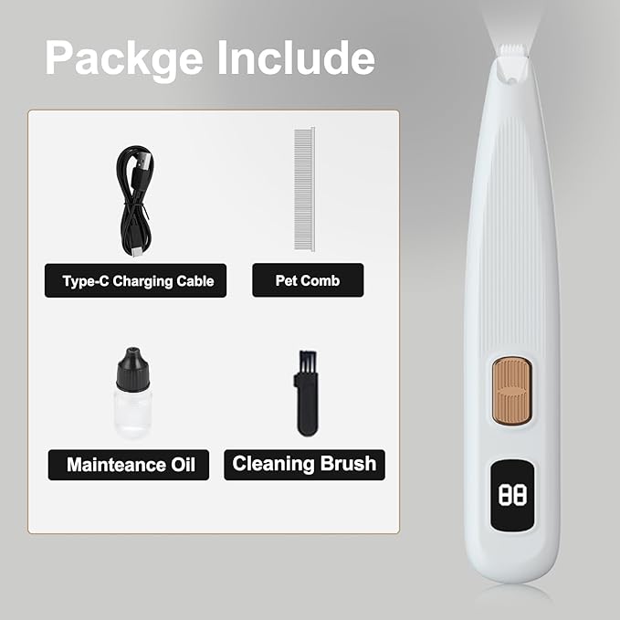 - What’s Included: Each package contains an electric dog trimmer for paws, a Pet paw trimmer, 1*maintenance oil, a User manual, and a Pet comb. Which keeps the dog hair trimmer in top condition for long-term use