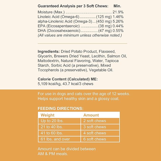 - SUPPORTS COAT HEALTH & APPEARANCE: The essential fatty acids found in the derived from salmon oil, fish oil, and flaxseeds promotes and supports healthy skin and fur by working at the cellular level to support the body's natural defenses. Skin defects can be caused by omega imbalances. This dog supplement not only provides vital ingredients, it is formulated to balance the best omega 3 to omega 6 ratio.