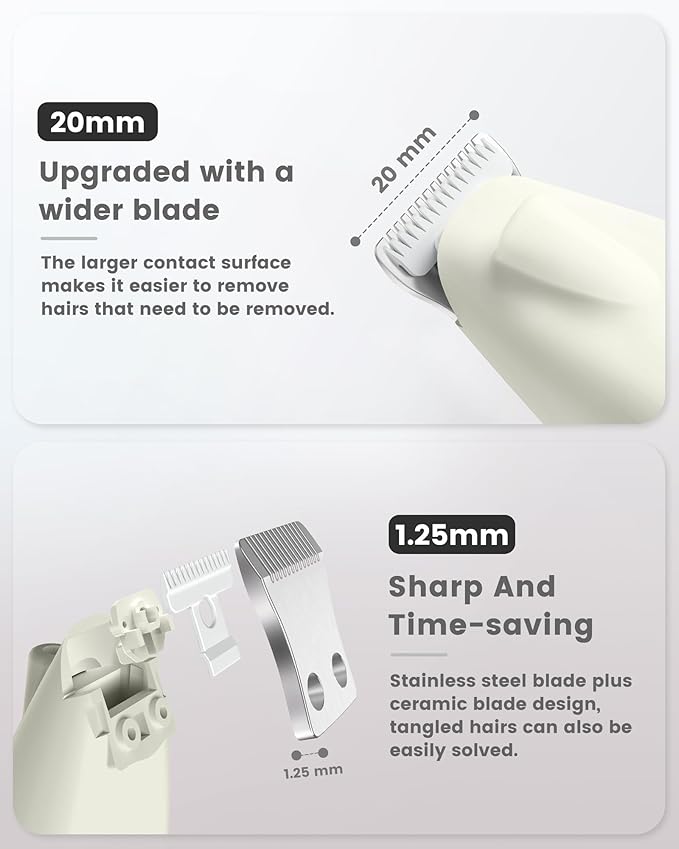 - 20mm Extra Wide Blade & Safe: This cat hair clippers is designed with ceramic blades plus stainless steel blades, which is sharper and saves time effectively. Designed for cleaning small area of pet's hair. The blades have a circular toothed moving blade, which speeds up heat dissipation while increasing the shaving area. The blades will not burn or scratch your pet, improving the efficiency of small area trimming, perfect for small areas such as paws, ears, eyes, hips and more