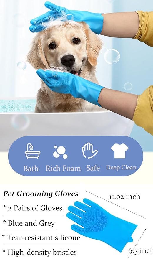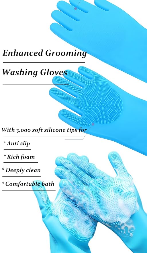 - Pet Grooming Gloves -- With 3,000 silicone tips on grooves to provide an enhanced grooming for rich foam, deeply clean, massage and comfortable bath; This dog bath gloves are made of tear-resistant silicone and high-density bristles, durable, safe and gentle for pets.