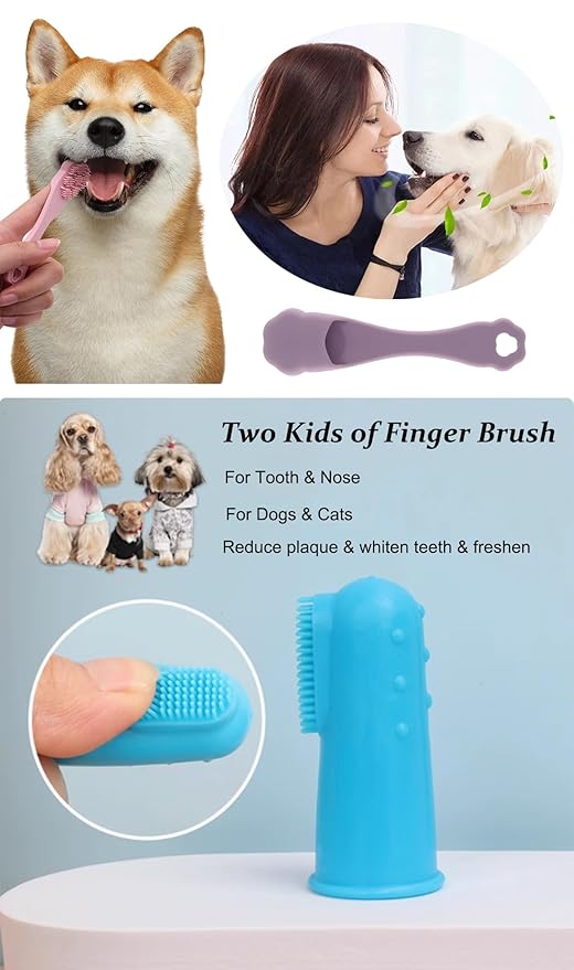 - Dog Finger Toothbrush -- both for nose and teeth cleaning; silicone bristles are soft on gums but abrasive enough to remove plaque and debris, make breath-freshening.