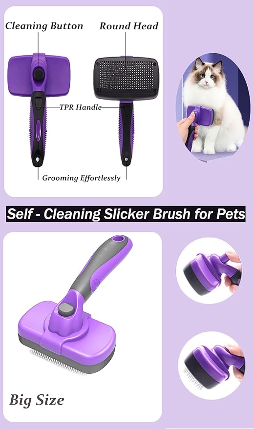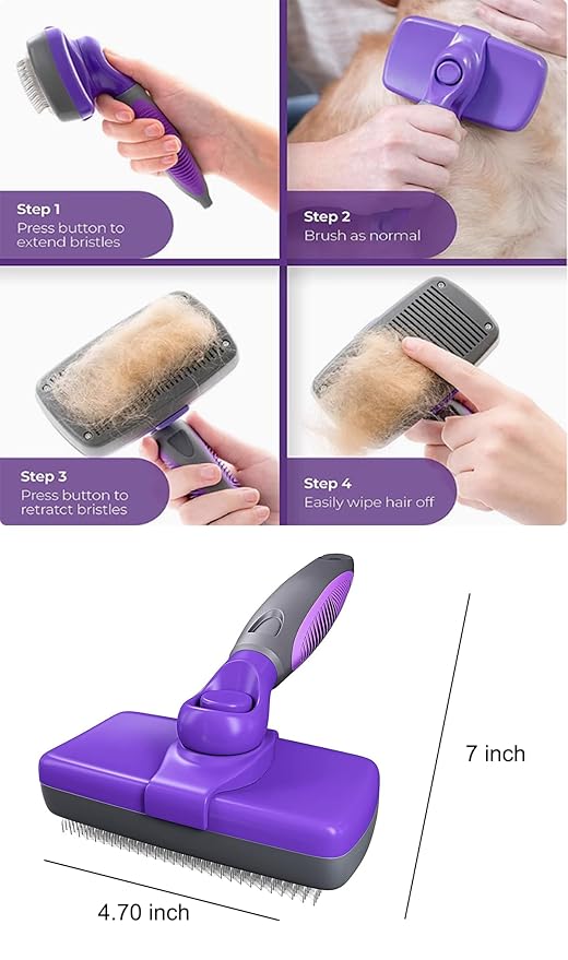 - Self Cleaning Slicker Brush for Dogs -- Premium stainless steel metal needls with protective plastic round head bristles make safe and comfortable shedding, grooming, deshedding and so on. And, press the bottom for to clean hairs.