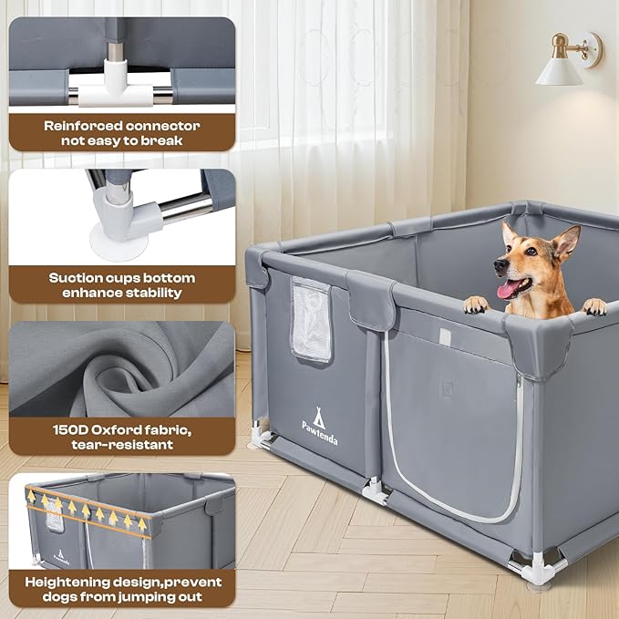 - 【Attention to use】Our side fabric is highly effective in resisting the biting and scratching of puppies, but its tear-resistant properties are significantly reduced when facing adult dogs. Therefore, we do not recommend leaving adult dogs alone in the playpen.