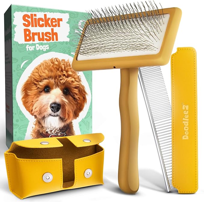 - [COMPLETE GROOMING SET] Comes with a dog slicker brush and a comb for goldendoodles, neatly stored in two vegan leather cases. This doodle brush for dogs is easy to use and doubles as an essential goldendoodle brush to keep coats tangle-free.