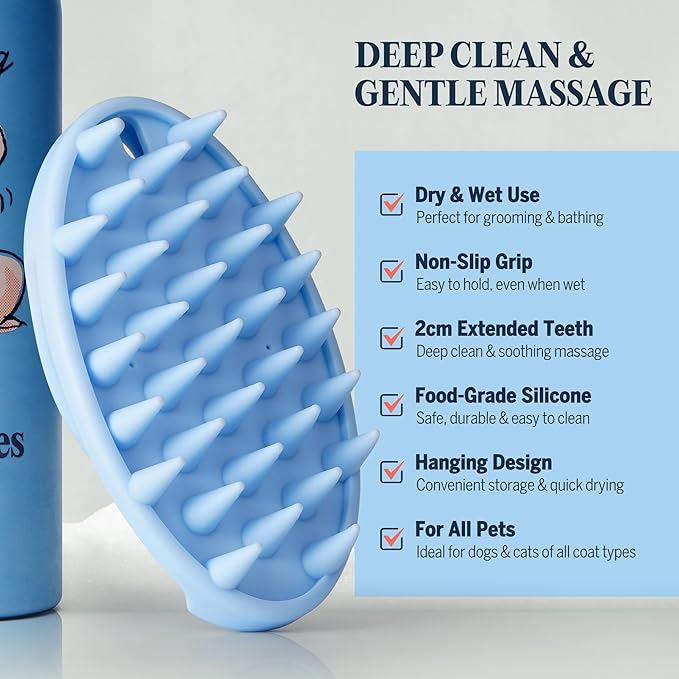- Enhance your pet’s bath with the Soft Silicone Brush – cleans, massages, and distributes shampoo evenly. It removes loose fur and soothes sensitive skin, perfect for daily grooming and spa-like care at home