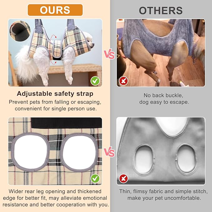 - Comfortable and Safe Hanging Dog Harness for Nail Trimming- 3D air mesh with thickened edges makes this pet grooming sling increase breathability and sturdiness. In addition, dog/cat restraint grooming bag has an Upgraded wider under body support & larger frontal chest/neck space, plus more spacious hind leg openings to keep back legs from pinching. Our Heavy-duty carabiners with better weight bearing, and are more durable secure than other S-hooks