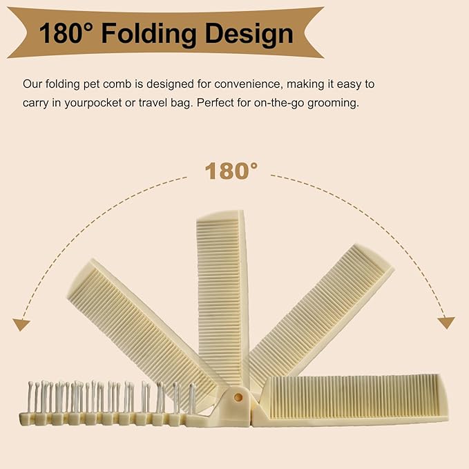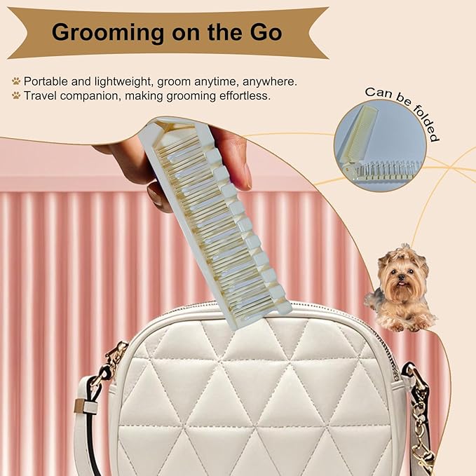 - Foldable Compact Design features two interchangeable comb heads that collapse into the BPA-free plastic handle for effortless storage and travel-friendly portability making it ideal for grooming small dogs like Yorkies Shih Tzus and Maltipoos during trips or outdoor adventures while protecting soft puppy skin with flexible bristles