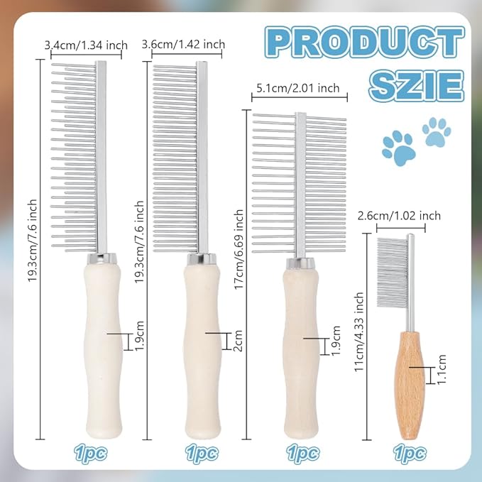 - Size Details--2pcs single sided pet combs are 193x34x19mm/7.6x1.34x0.75 inch, 193x36x20mm/7.6x1.42x0.79 inch , 1pc double sided pet comb is 170x51x19mm/6.69x2.01x0.75 inch, pet eyebrow comb is 110x26x11mm/4.33x1.02x0.43 inch, medium size and easy to use