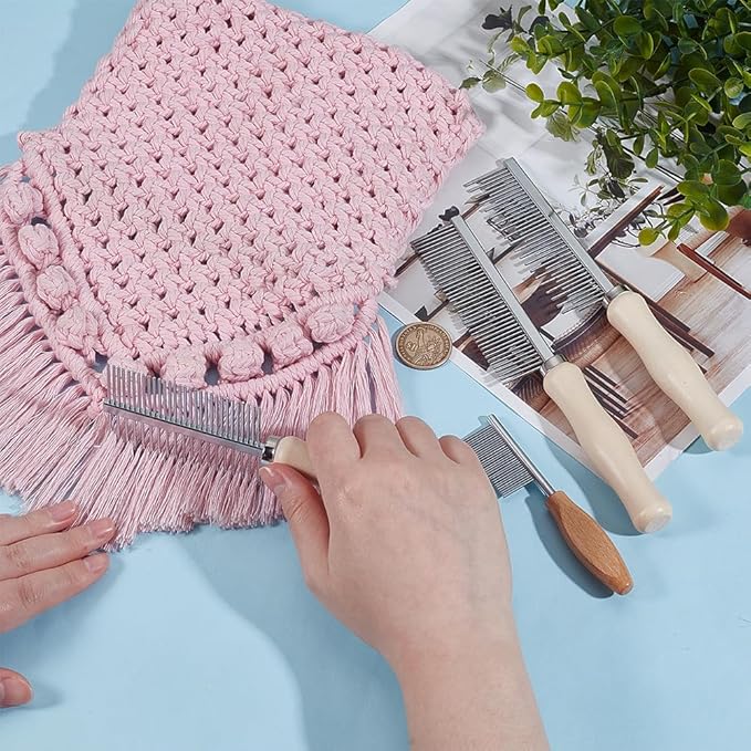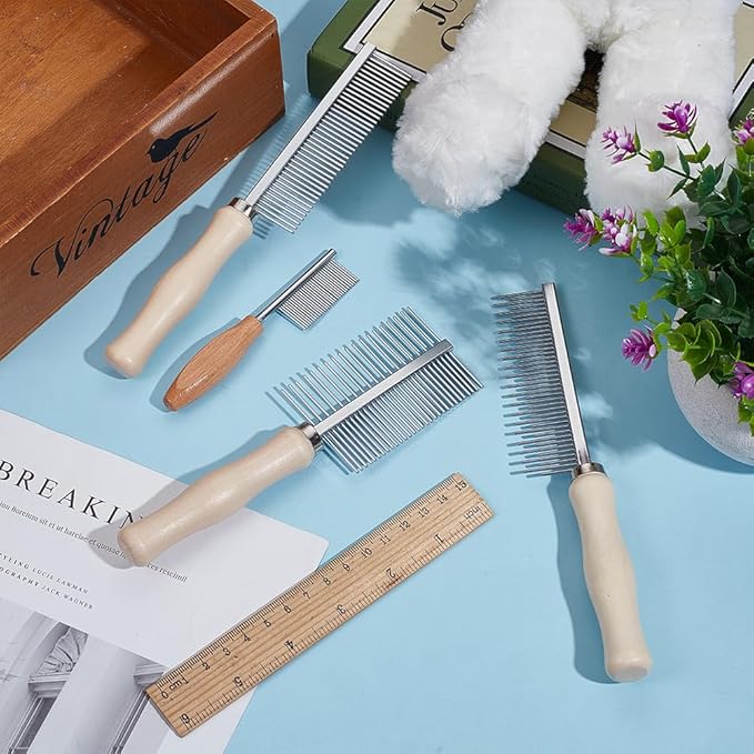 OLYCRAFT 4Pcs 4 Styles Wood Pet Combs Stainless Steel Pet Combs with Wood Handle Grooming Tool for Pets Macrame Fringe Combs Tassel Brush Pet Grooming Supplies for Pet Removing Tangles and Knots