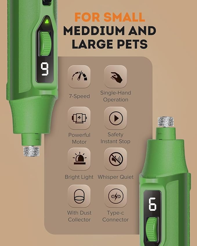 - INCLUDES DUST COLLECTOR: No more mess! The dog nail grinder features a built-in dust collector to keep nail filings contained, providing a tidy grooming session for both you and your pet.