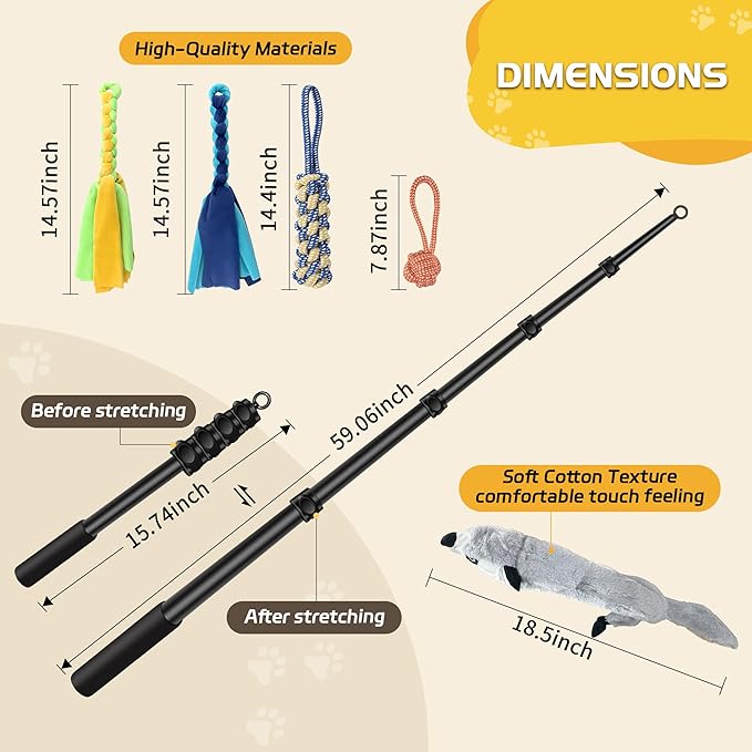 - 【Retractable & Lightweight】The flirting bar has a stretch length of 59.06 inches, a retraction length of 15.74 inches, a nylon rope length of 43.3 inches, and a pole weight of only 204 grams. Ideal for playing and exercising with your dog in all types of places.