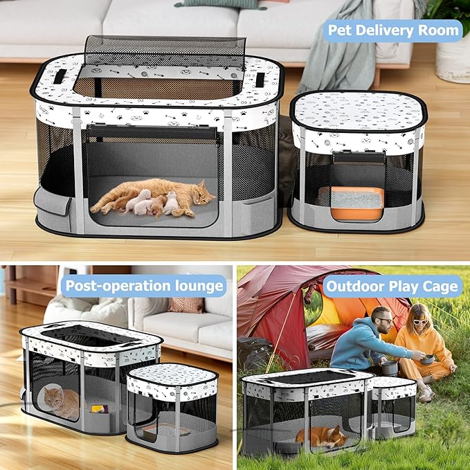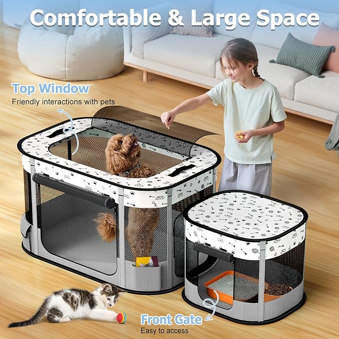 - Separate Areas Design : The cat play pen has two separate functional areas for feeding, resting, playing and using the litter box. Create a tidy, cozy and quiet living space for your feline friend