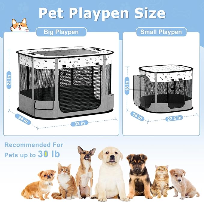 - Large Size Playpen : 32"L x 24" W x 22 "H . The pet playpen indoor is designed with two pockets on the side, which are convenient for storing your pet's needed items. Suitable for small animals such as puppy, kitten, cat, dog, rabbit, etc