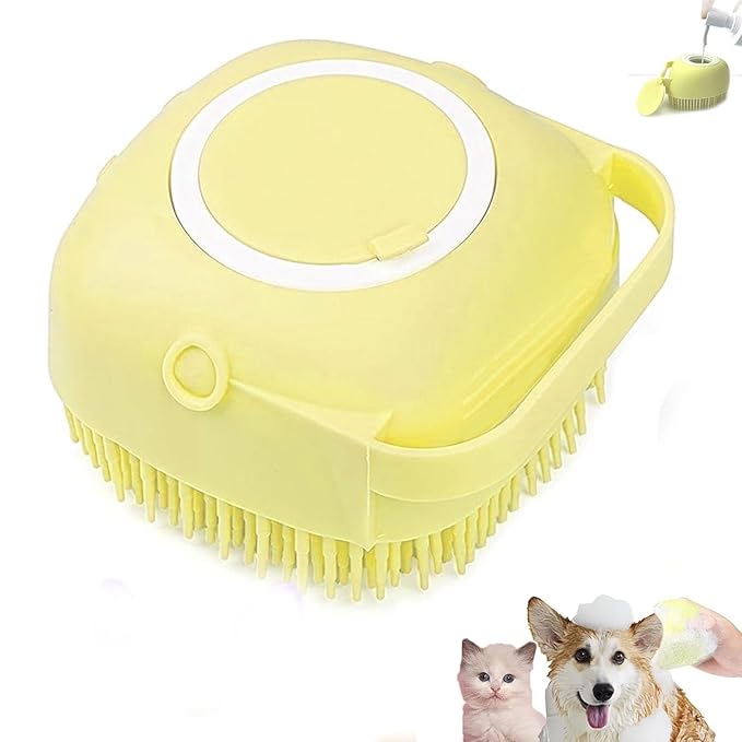 Pet Bath Scrubber Brush, Dog Grooming Massage Shampoo Bath Brush with Soap and Shampoo Dispenser Soft Silicone Bristle for Long Short Haired Dogs Cats Shower (Yellow)