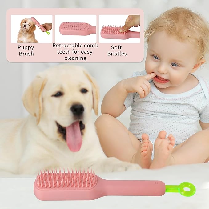 - Retractable Design: Small dog brush has a hook at the tail to control the extension and retraction of the comb teeth. In addition, the retractable design of puppy brush is easy to carry and store. When you don't need to use it, you can shrink the comb to the smallest state and put it in a bag or drawer without taking up extra space.