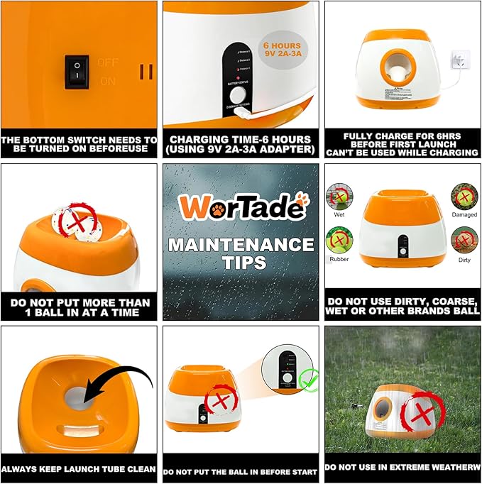 - 🟠Note: It is recommended to use a 9V2A (18W) charger to charge the automatic dog ball launcher. This ball thrower for dogs is recommended for use in open outdoor areas. If you need any help or have any questions during use, please feel free to contact us and we will provide a satisfactory solution in a timely manner.