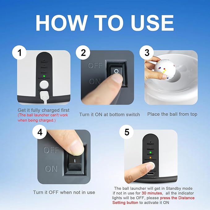 - Standby Mode: The dog ball launcher has a power-saving setting. If it is not used for half an hour, it will automatically enter standby mode, all indicator lights will turn OFF and it can't work. Please just press the Distance Setting button to reactivate the device.