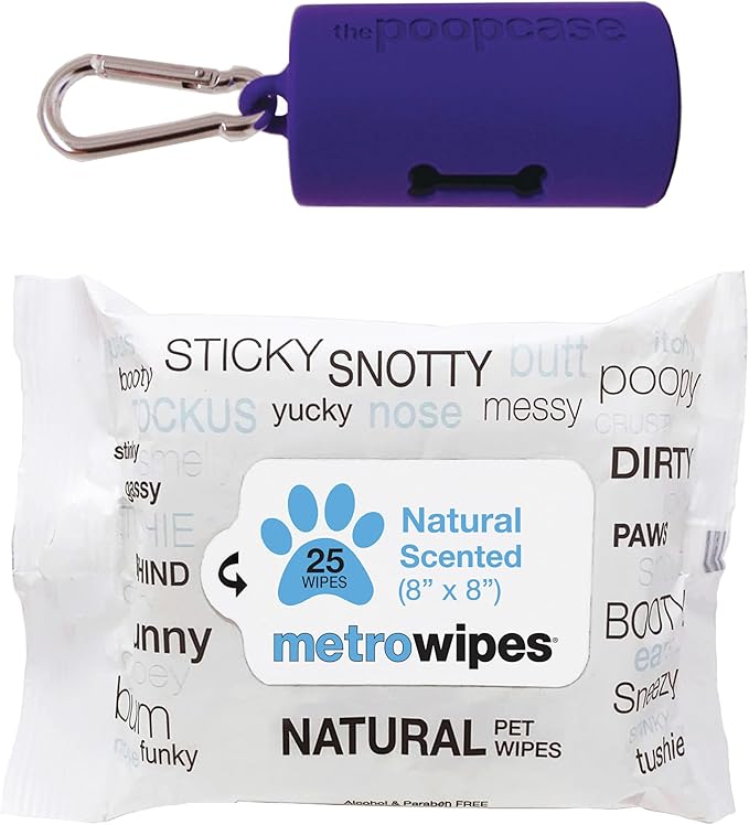 MetroPaws Unscented Dog Wipes, 25 Extra Large, Thick Cleaning Wipes & The Dog Waste Bag Dispenser & Holder, Bag Holder With 20 Bags for Leash - Purple
