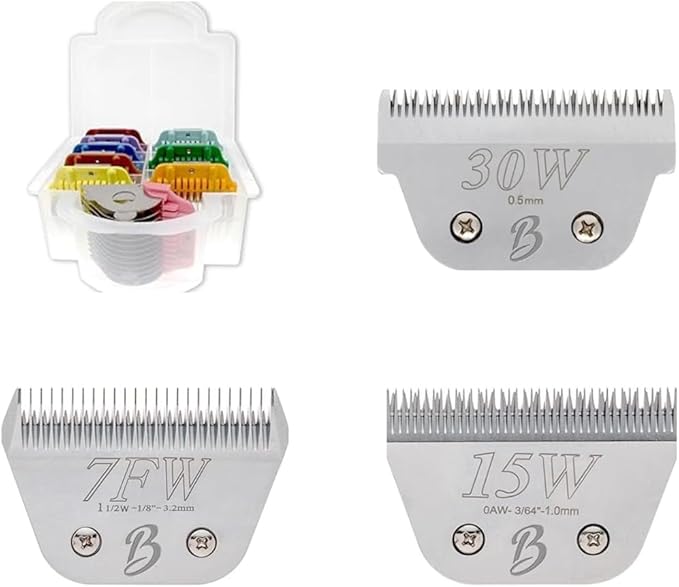 Wide Dog Grooming Blade & Guard Bundle – Includes 30W, 15W, 7FW Detachable A5 Blades & 9-Piece Color Coded Clipper Guard Set – Carbon Steel Blades for Professional Groomers