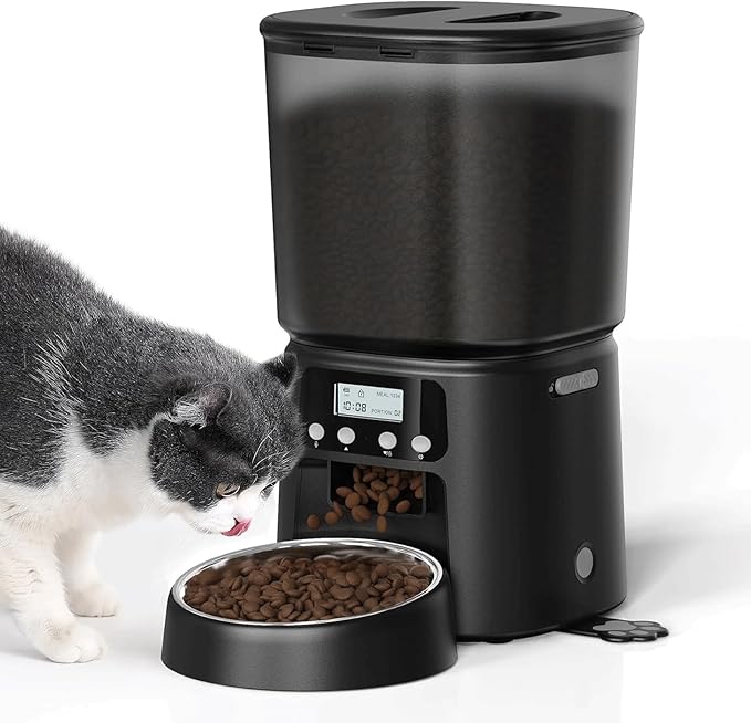 Automatic Cat Feeder, 4L Timed Dry Food Dispenser with Stainless Steel Bowl, Pet Food Feeder for Cats & Small Dogs, Programmable for 6 Meals & 30 Portions Per Day, 10S Voice Record, Dual Power, Black
