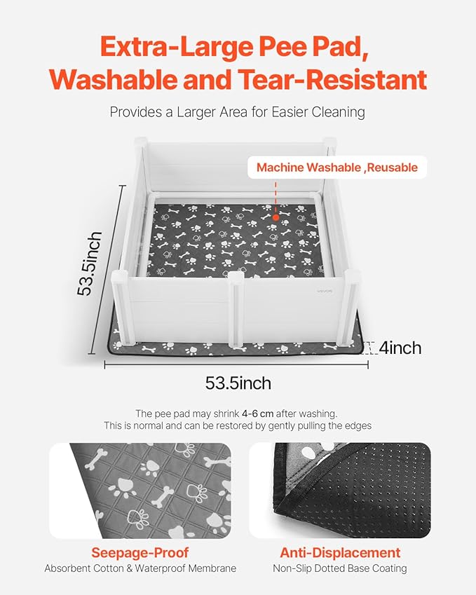 - Oversized Waterproof Pad: Includes a 53.5x53.5 inch / 1360x1360 mm pee pad with absorbent cotton and waterproof backing. Anti-slip dots on the bottom keep it in place. Machine washable and reusable. A natural shrinkage of 4 to 6 cm may occur after washing—gently stretch the edges to restore