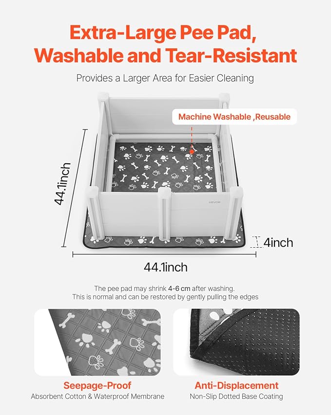 - Oversized Waterproof Pad: Includes a 44.1x44.1 inch/1120x1120 mm pee pad with absorbent cotton and waterproof backing. Anti-slip dots on the bottom keep it in place. Machine washable and reusable. A natural shrinkage of 4 to 6 cm may occur after washing—gently stretch the edges to restore