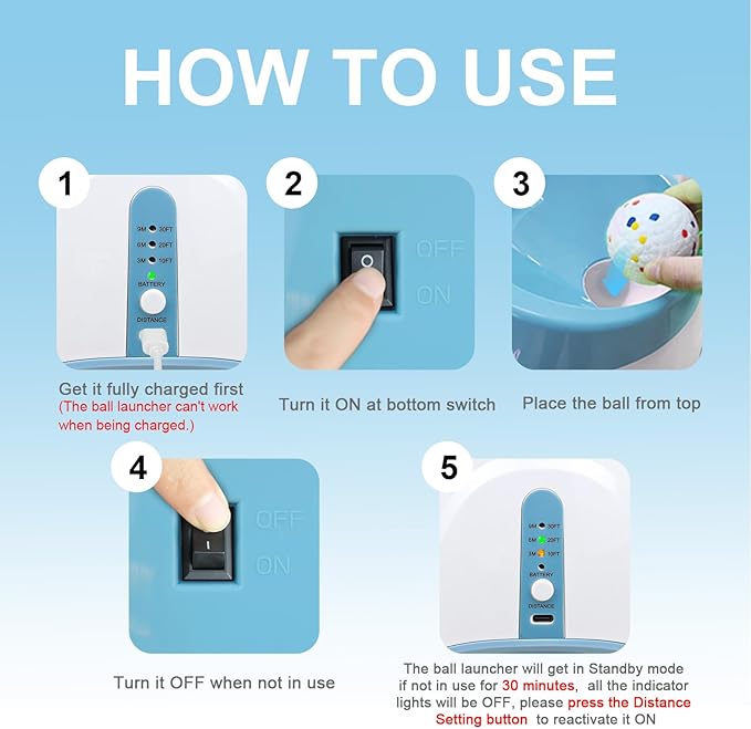 - Standby Mode: The dog ball launcher has a power-saving setting. Once it is turned ON but not used for 30 minutes, it will automatically enter standby mode, all indicator lights will turn OFF and it can't launch the ball. Please just press the Distance Setting button to reactivate the ball launcher.