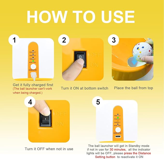- Standby Mode: The dog ball launcher has a power-saving setting. Once it is turned ON but not used for 30 minutes, it will automatically enter standby mode, all indicator lights will turn OFF and it can't launch the ball. Please just press the Distance Setting button to reactivate the ball launcher.