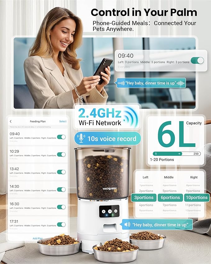 - Special Feature : Multiple Pet Feeding, Jam-Proof, Fresh-Keep, WiFi Enabled, App Control, 6L Storage, Voice Recording