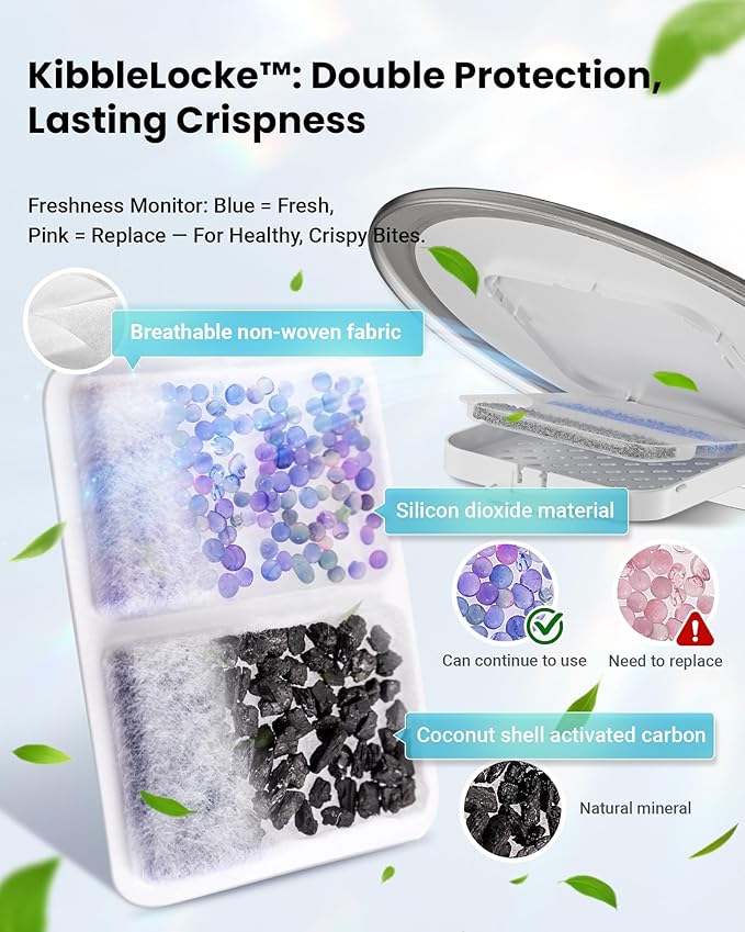 - Keeps Food Fresh Longer: This cat feeder automatic built-in dual desiccant system helps lock in freshness and flavor. With a color indicator, you’ll always know when it’s time to replace for the best-tasting meals your cat deserves. The cat feeder also comes with 3 pet food desiccant bag to keep your pet’s food crisp and tasty for months without worrying about running out.