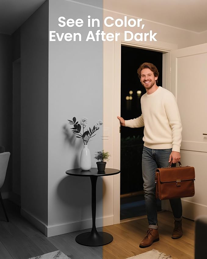 - (2). [3K Ultra HD with Full Color Night Vision & 2.8-inch HD screen] __This smart indoor camera has a 5MP resolution and three modes night vision technology (full color, black and white, smart), providing clear images day or night. It is equipped with a 2.8-inch HD screen that displays the date and weather information. You can monitor your home effectively, keep an eye on baby, pets or elderly with ease.